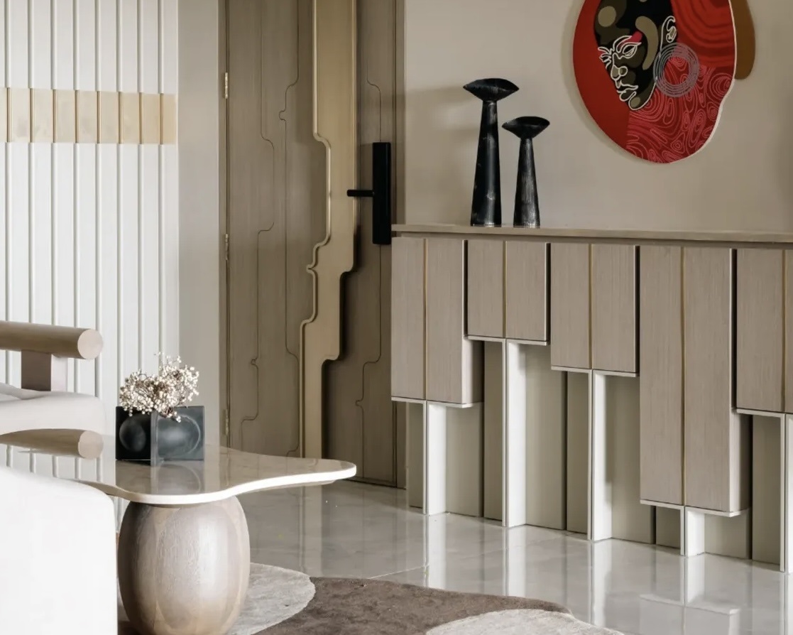 The interiors unfold as a unified experience, where ornamental elements, textured surfaces, and bespoke detailing create a sense of grandeur without excess. Each space flows seamlessly into the next, maintaining a balance between opulence and comfort.