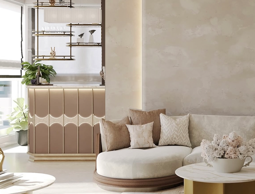 A neutral base palette sets the foundation, enhanced by warm textures, soft accent tones, and carefully curated materials. Clean lines, minimal forms, and seamless finishes define the space, allowing natural light to enhance depth and openness throughout the home. Custom-designed furniture and integrated storage solutions ensure visual clarity while maximizing usability.